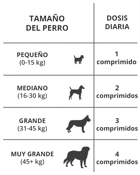 - Para perros de más de 45 kg, 4 comprimidos masticables al día solos o mezclados con su comida.